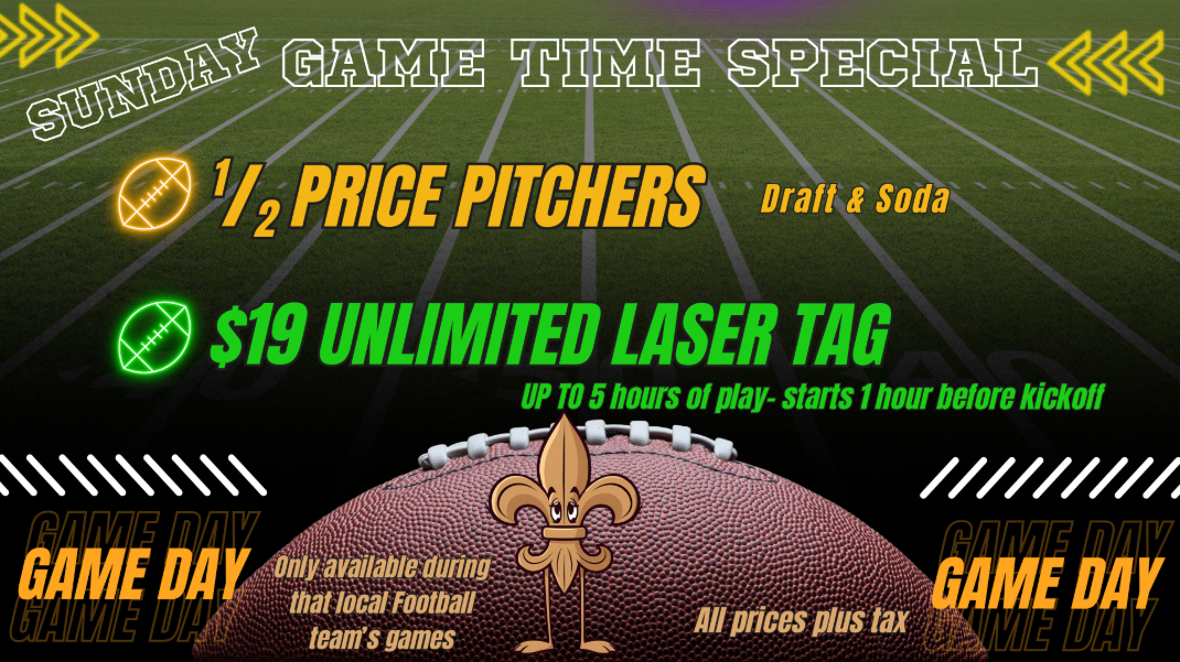 Up to 5 hours of Laser Tag. Starts 1 hour before kickoff and ends at the last whistle. Only available during that local team's football Game. All Prices plus tax.